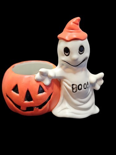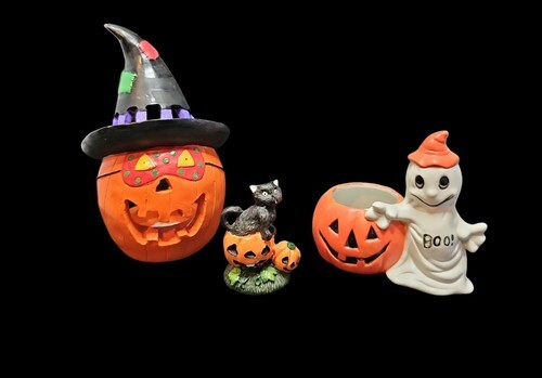 UP FOR SALE: Vintage Halloween Figural Fall Decor Black Cat Ghost Jack O Lantern Lot Of 3 Pcs