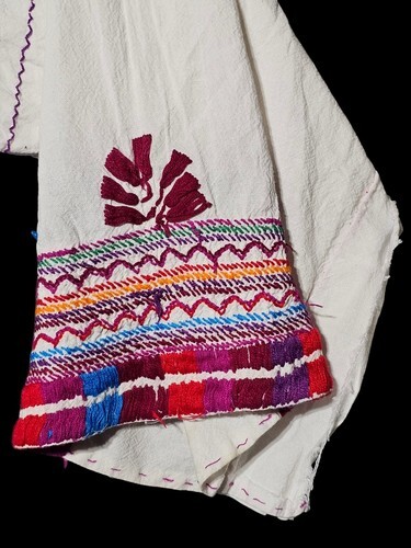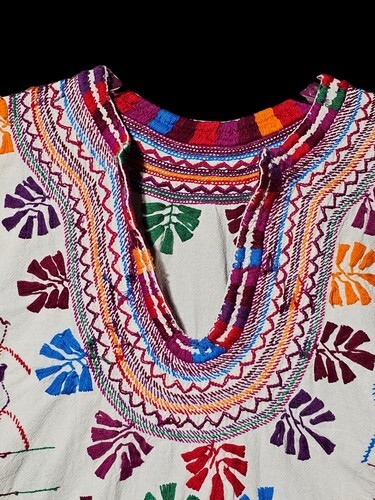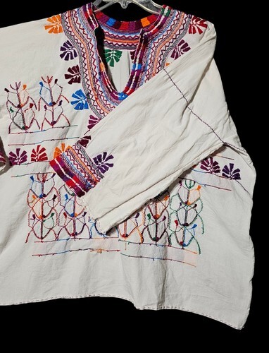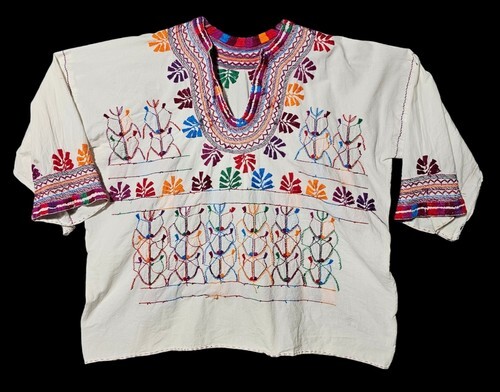 This blouse appears to be Mesoamerican in origin, particularly from Mexico (e.g., Oaxaca or Chiapas) or Guatemala, where such embroidered garments are part of everyday wear or ceremonial attire.