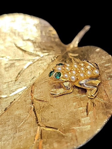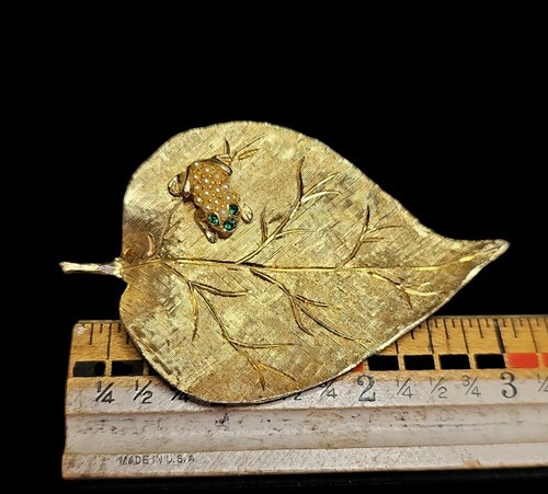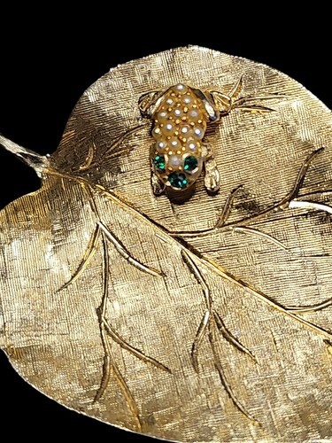 UP FOR SALE: Vintage LEDO 1962 Golden Flower w/Green Rhinestone Frog Toad Estate Brooch Pin