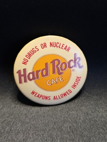 UP FOR SALE: Vintage 1980s Hard Rock Cafe Pinback-No Drugs Or Nuclear Weapons Writing in Red