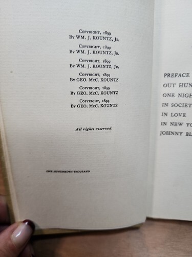 Red Raven Corporation, Red Raven, PA, 1899; 12mo, 90 pages; First Edition, enlarged; illustrated cloth boards; untrimmed page edges; top edges gilt. A series of riotous tales relating the escapades of fictional bon-vivant Billy Baxter, written in the form of fictional letters addressed to an absent chum, identified only as "Jim." Authored by William J. Kountz, Jr., founder of Red Raven Corporation, manufacturers and bottlers of Billy Baxter carbonated sodas. The stories were first published individually in booklet form as a product promotion between 1888-1889 and made available to the public via post for the price of an envelope and the enclosure of four unused 1 postage stamps. (In an ad for the booklets, the author admonishes the public, "Do not lick the stamps and attach them to your letter of request, as at some future date we may need to use same, and the Government foolishly requires a whole stamp.") The booklets achieved instant popularity, and in less than a year?s time the author became a celebrated humorist, with over three and a half million copies of the stories had already been distributed. Kountz was deluged with offers for his writing talent from many quarters throughout the United States, but viewing himself primarily as a businessman, and his literary endeavors as merely an amusing sideline, he declined them all. Just days after the completion of "In New York," in August of 1889, William J. Kountz, Jr. died suddenly at age 31. That same year, as a tribute, his firm published a hardback edition containing four stories: "One Night," "In Society," "In Love," and "In New York," with an introductory preface by his brother and business partner, George McCullin Kountz. In 1913 the present enlarged edition was released, containing the four original stories and preface, plus two previously unpublished pieces: "Out Hunting," and "Johnny Black?s Girl," a total of six stories in all. Billy Baxter is notable not alone for his urbane sense of humor and his misadventures, but as well for his liberal use of an original type of sophisticated slang which predates P.G. Wodehouse?s Bertie Wooster by some thirty years. Beautifully illustrated with six b w plates by Anna Burnham