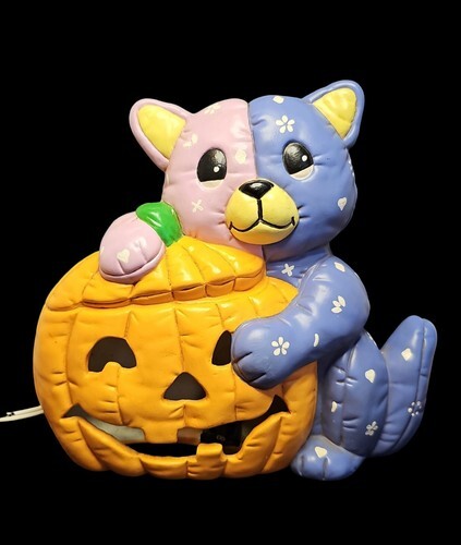 Vintage 1986 Scioto Halloween Puffy Ceramic Cat Jack O Lantern Pumpkin Light Up