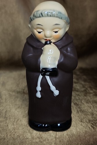 Goebel issued a series of approximately 125 different items forever immortalizing the good Friar Tuck. Other than their Hummel series, this was perhaps Goebel's most popular and most successful line. The line was introduced in the early 1950?s and most of the items showed the good friar wearing sandals. These are called ?with toes?. About five years later, some efficiency expert realized Goebel could save time and money by painting the feet all black and they are called ?with shoes?. The line was discontinued in the early 80?s when Goebel realized they had been using bad paint in the brown. Some of the line was introduced in the mid 80?s with black collars, that is, a black paint where food or drink might touch. The faces also had a very shiny finish. Like almost all the Goebel items, the line was discontinued in 1988.