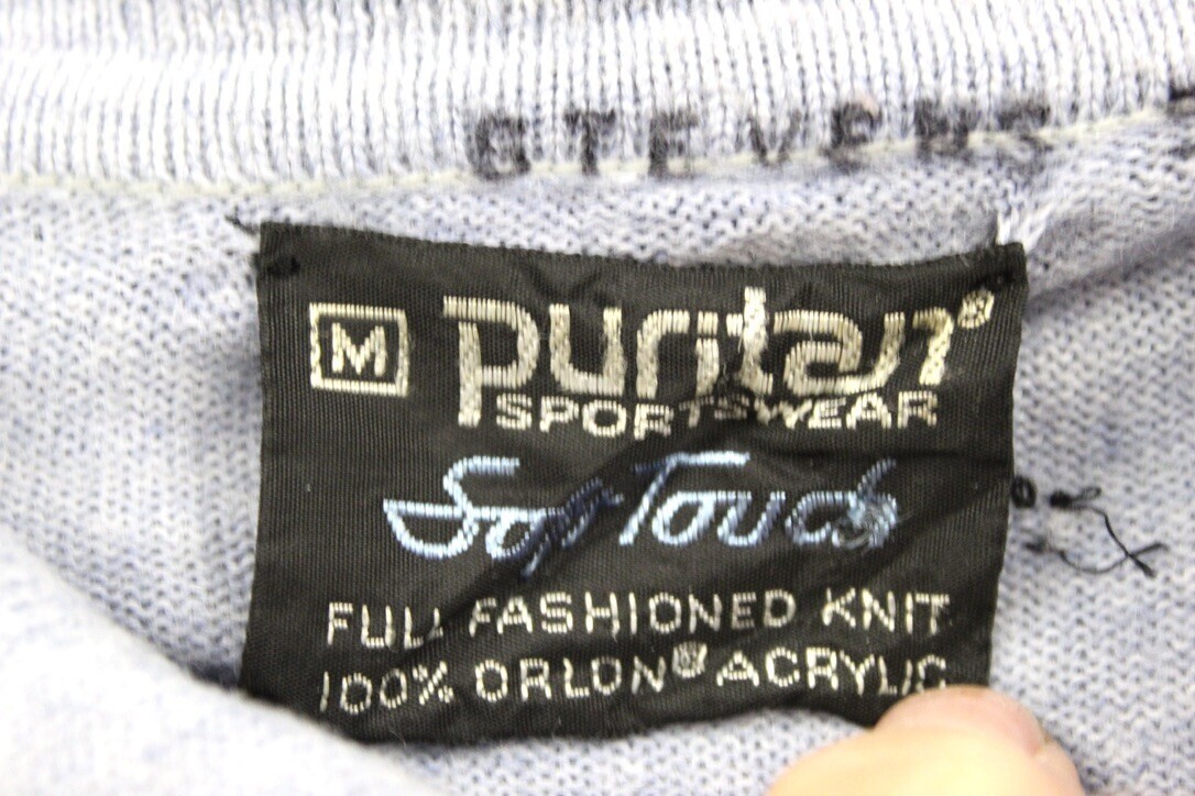 Puritan was one of the iconic American knitwear brands of the mid-20th century, known for soft acrylic blends and classic collegiate silhouettes. Pieces like this polo sweater reflected the preppy-meets-leisurewear trends of the 1970s.