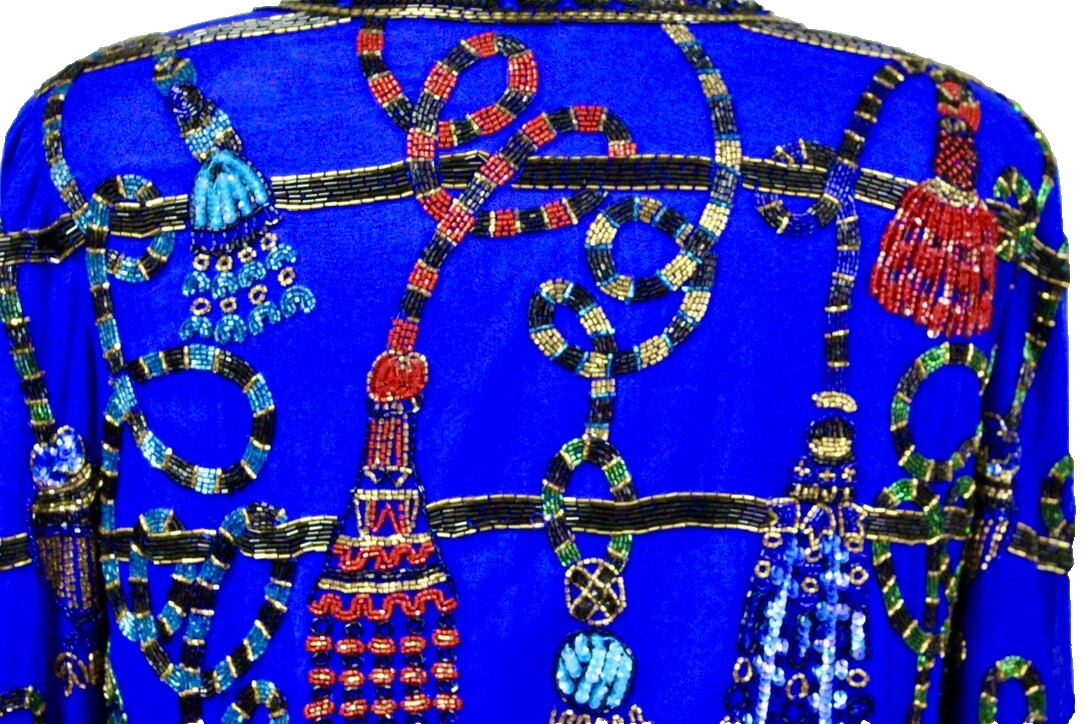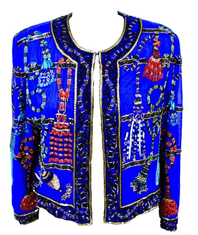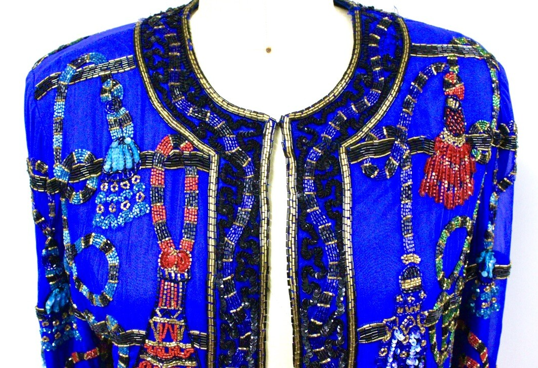 1980s VTG Sally Musto Accents Blue Beaded Tassel Evening Jacket Sz L Silk Blend