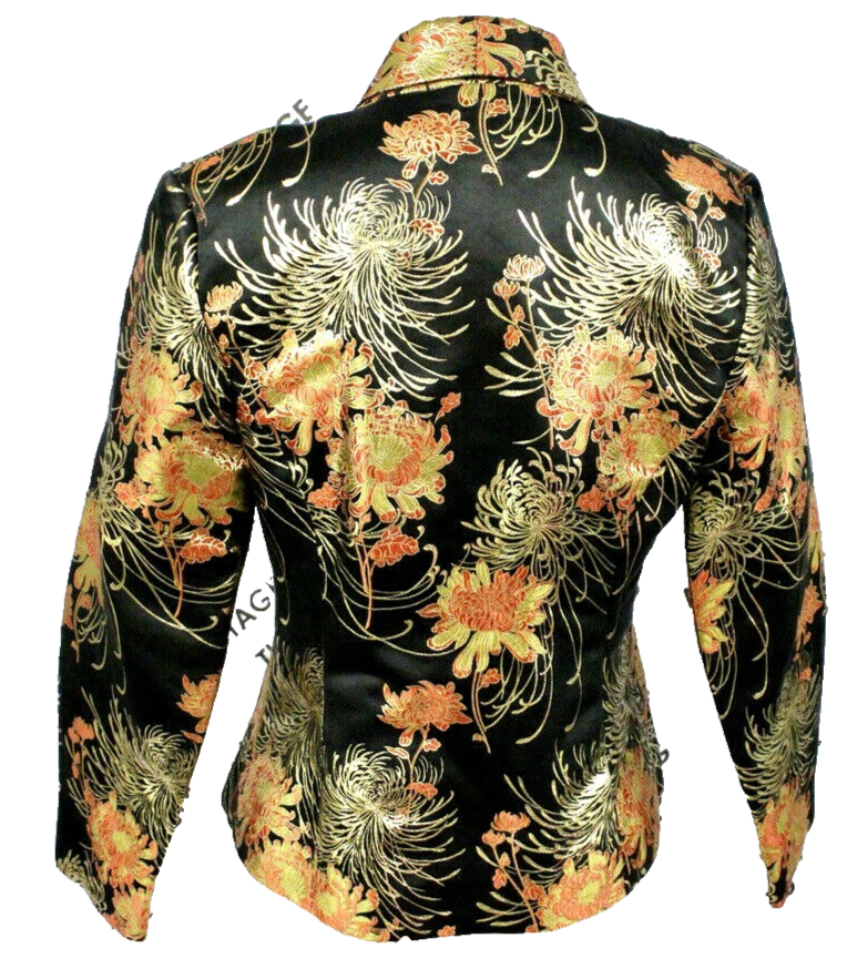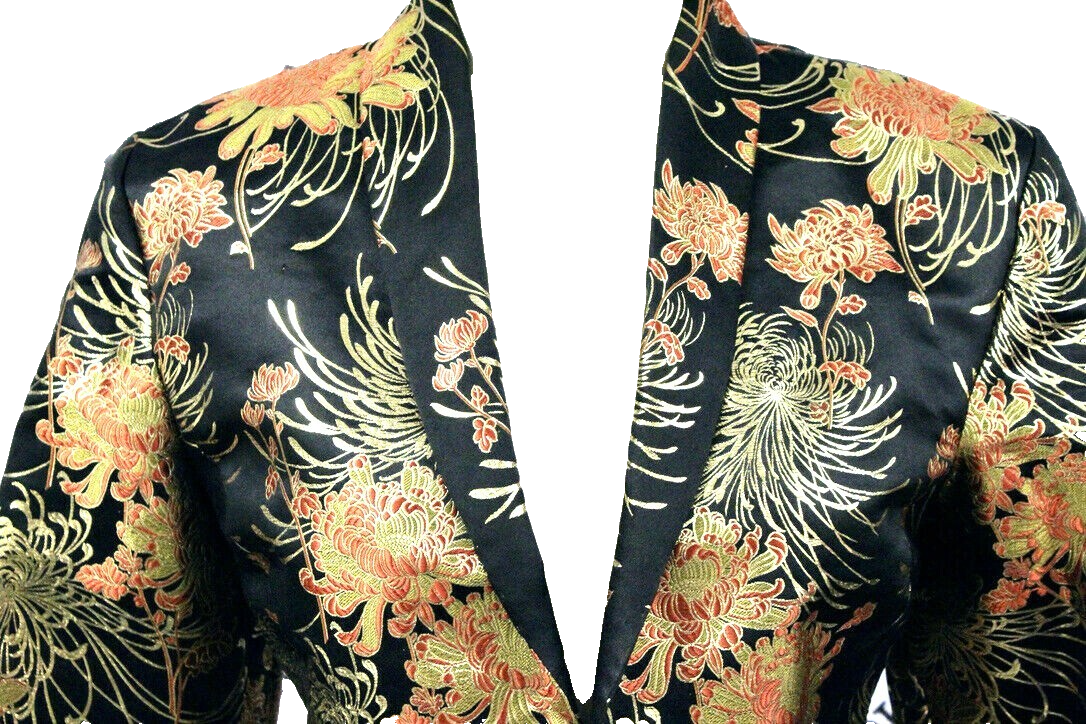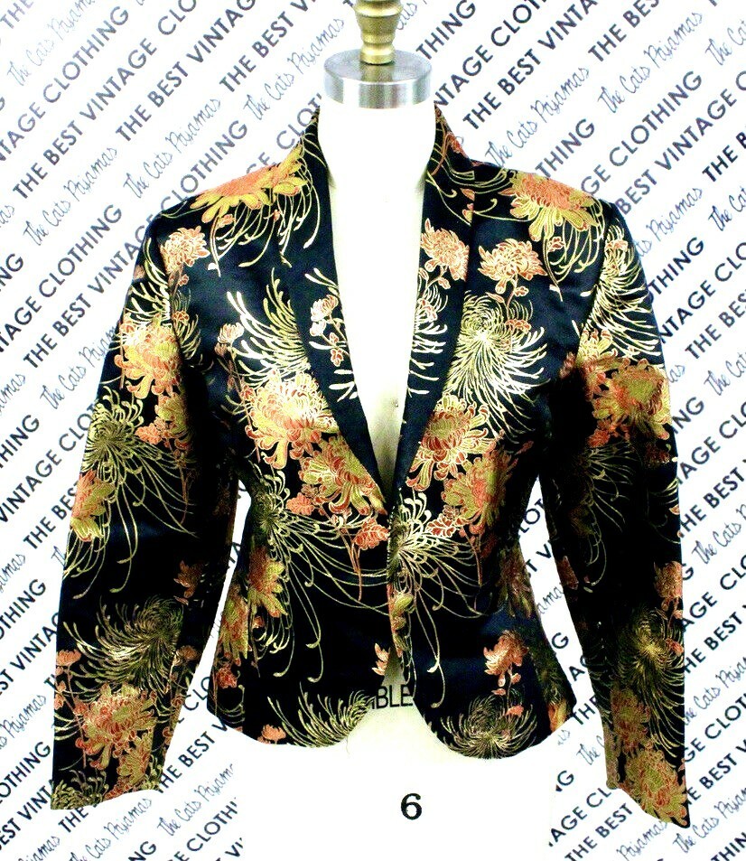 VTG Joan Maxwell Silk Satin Damask Evening Jacket Gold Chrysanthemum Red Lining