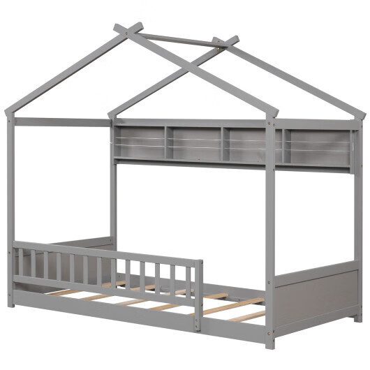 Twin Size House Bed with Storage Shelf and Headboard-Gray - Color: Gray
