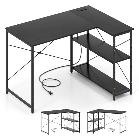 L-shaped 47 Inch Reversible Corner Desk with Adjustable Storage Shelves-Black - Color: Black
