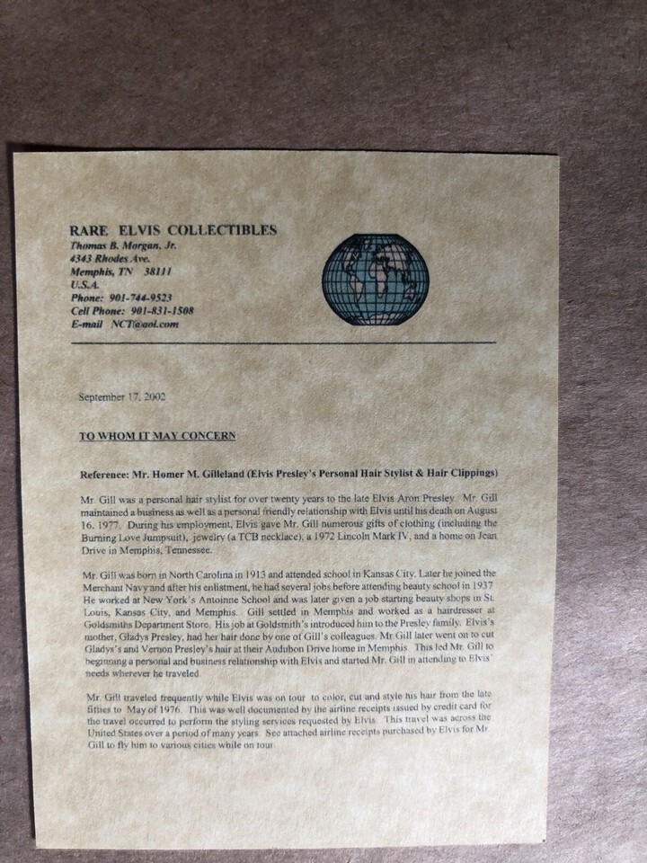 Authentic piece of Elvis Presley's hair COA certificate.. 13 x 16.