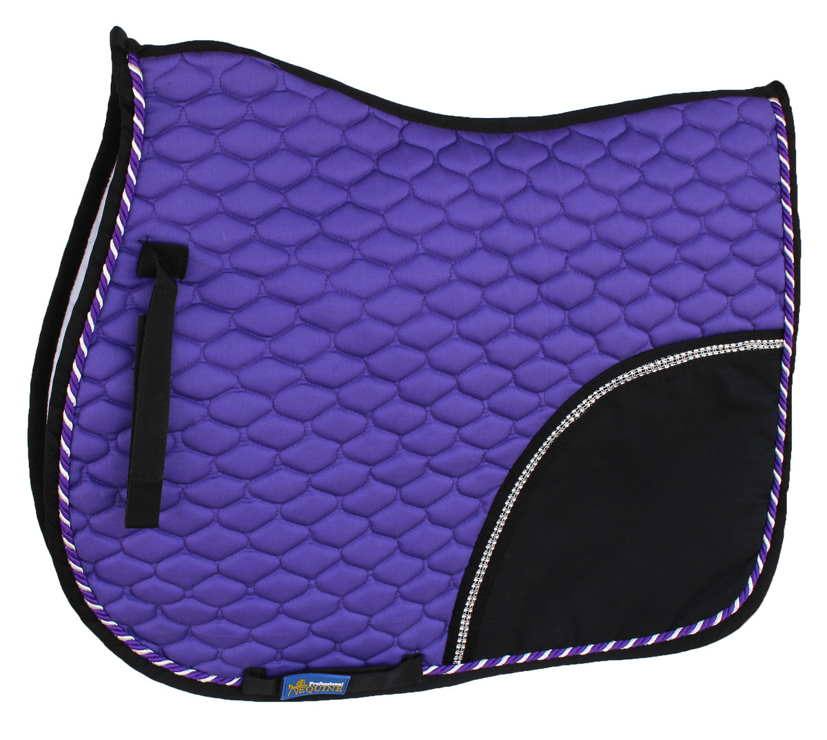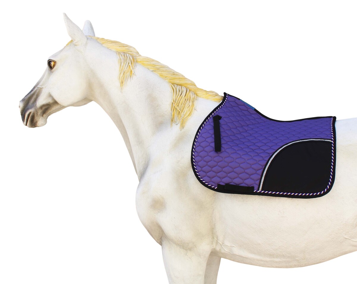 Classic contoured All-Purpose pad, with a moisture wicking quilted pattern. Features nylon girth/billet straps. Beautiful rolled trim pattern along with the crystals add a touch of glamour.