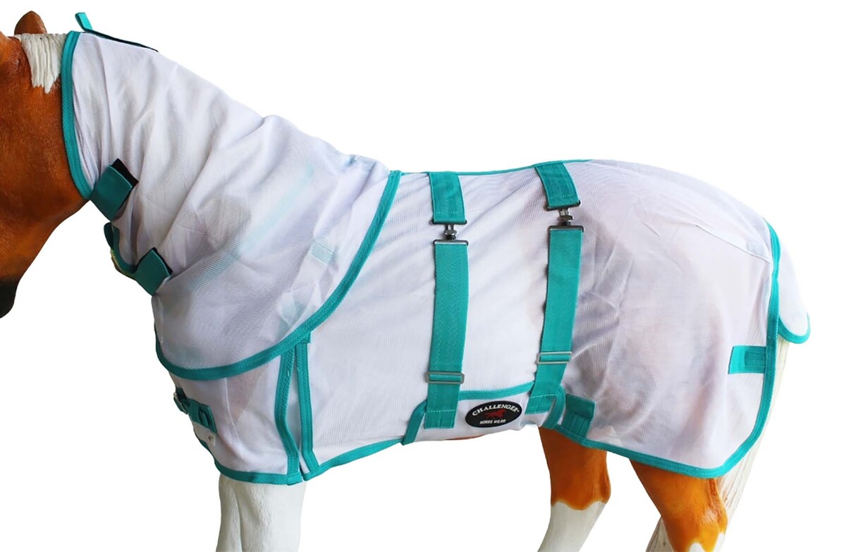 Challenger lightweight Foal/Miniature fly sheet provides protection against biting insects, and UV Rays. Helps your horse stay cool in direct sunlight and while allowing better air flow.