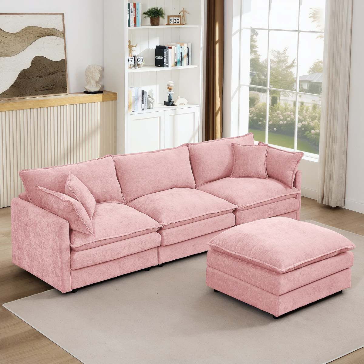 Pink Chenille Modular Sectional Sofa - L-Shaped Couch w/ Ottoman
