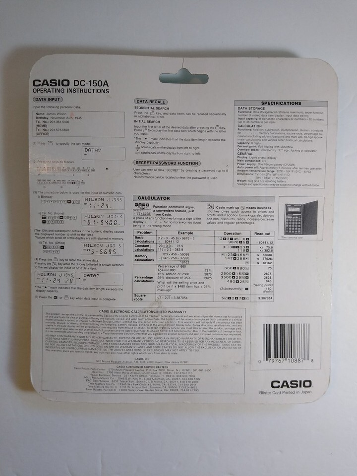 Explore the innovative Casio DC-150A Data-Cal calculator, a vintage electronic marvel designed with multifunctional features that go beyond basic calculations. This compact device boasts a personal directory capable of storing up to 50 numbers, including phone and credit card numbers, making it a unique blend of calculator and digital organizer. The calculator features a reliable secret password function for secure data storage, ensuring your personal information remains confidential.