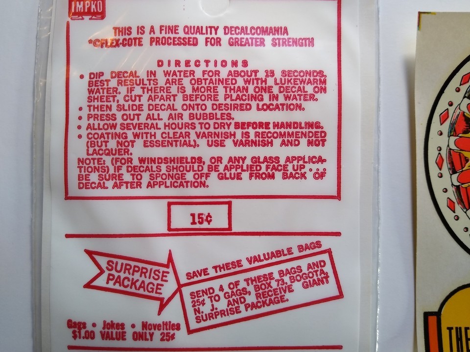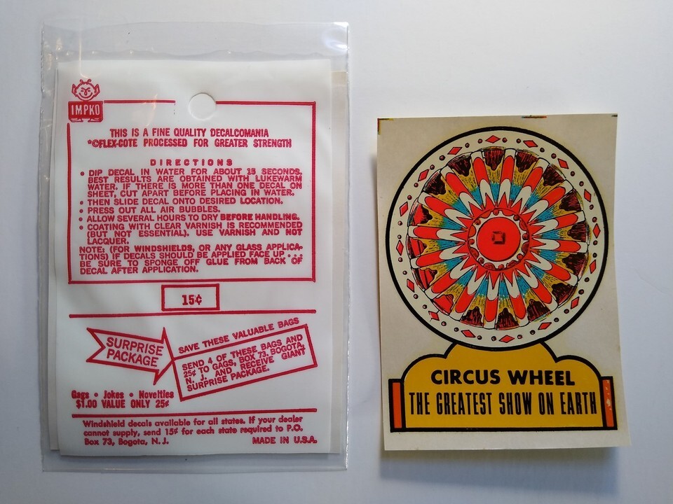 Up for sale is a vintage IMPKO brand decalcomania featuring a colorful 'Circus Wheel' design, proudly proclaiming 'The Greatest Show on Earth'. This classic advertising print decal comes in its original clear plastic packaging with instructions and a 15 price printed on the bag. The reverse side of the packaging offers a 'Surprise Package' for collecting multiple bags. The decal itself is vibrant with its circus-themed colors and appears unused. A charming piece of mid-century advertising memorabilia, perfect for collectors of vintage novelties, circus ephemera, or advertising art. Made in U.S.A.