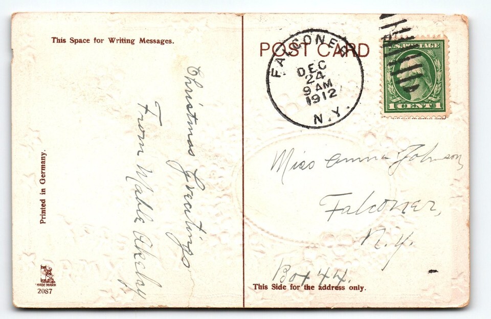 The reverse side bears a clear postmark dated December 24, 1912, from Falconer, New York, along with a 1-cent green U.S. postage stamp. The message area includes a handwritten holiday greeting, enhancing its nostalgic appeal. This original paper postcard, measuring approximately 5.5 x 3.5 inches, is a collectible piece for vintage Christmas postcard enthusiasts or those interested in early 1900s ephemera. Its combination of floral artistry, embossing, and historic postal markings makes it a standout addition to any holiday postcard collection.