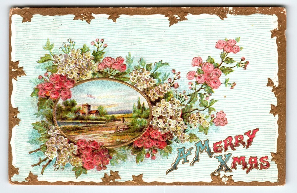1912 Embossed Christmas Postcard with Floral Wreath & Scenic View TEARS