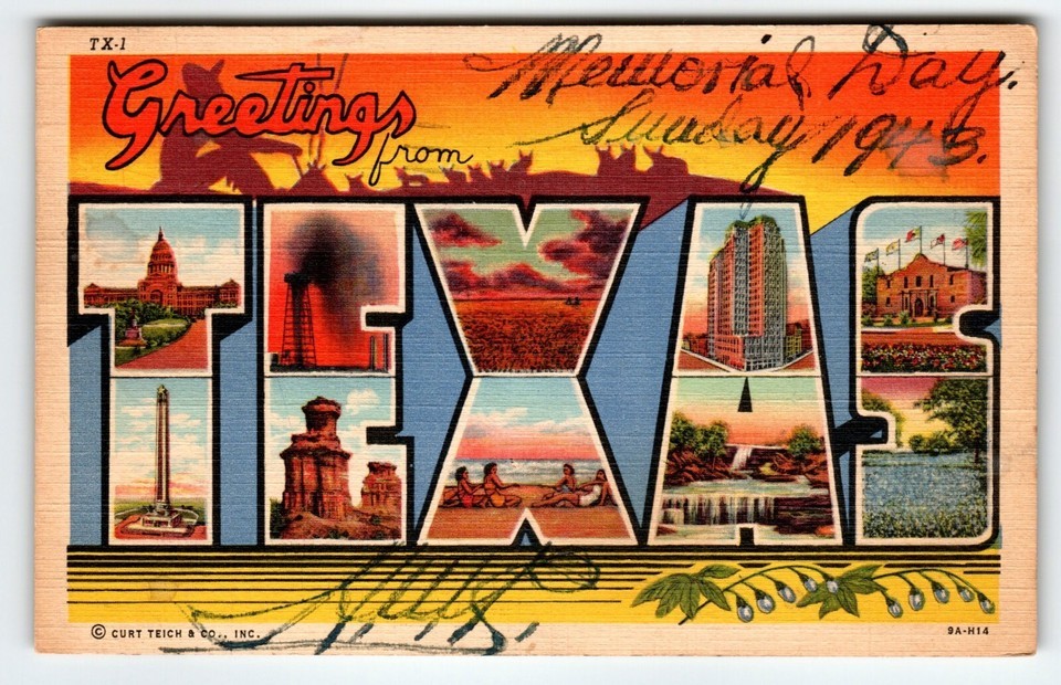 Greetings From Texas Large Big Letter Postcard 1943 Linen Unused Curt Teich