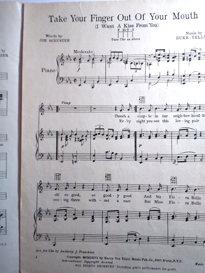 Take Your Finger Out Of Your Mouth Sheet Music 1926 Joe Schuster Duke Yellman