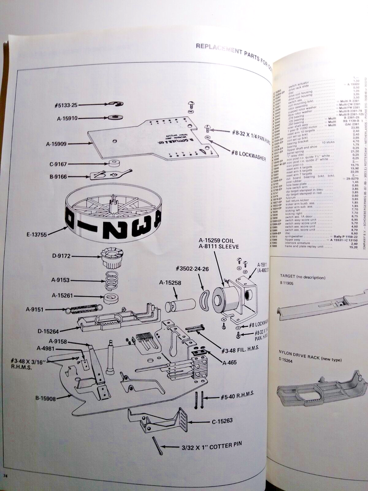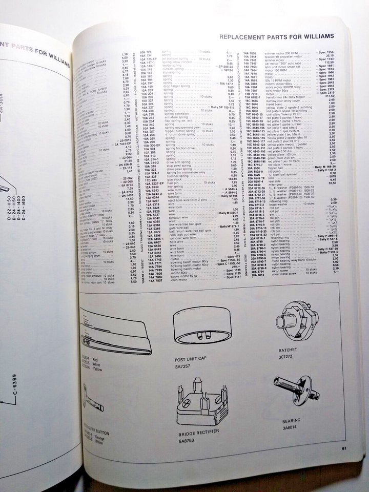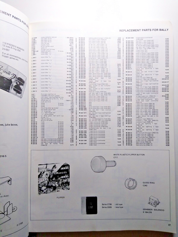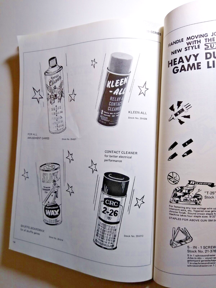 The product is a vintage 1977 parts catalog and price list from Suzo Trading Company, a Netherlands-based brand, for amusement devices, jukeboxes, arcade games, and pinball machines. This catalog provides information on various parts needed for arcade pinball machines from that era. Has creases, wrinkles, and age wear. Some foreign text. 145 pages of great info.