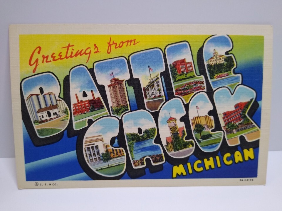 Greetings From Battle Creek Michigan Large Big Letter Postcard Linen Unused