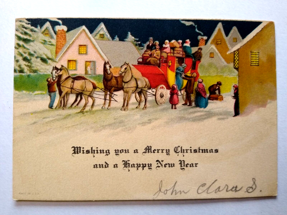 New Years Christmas Early Greeting Card Victorian People In Village Horses Cart