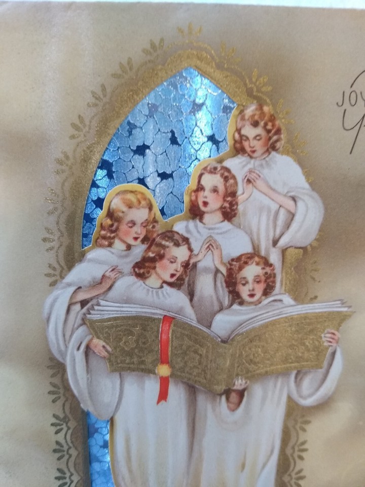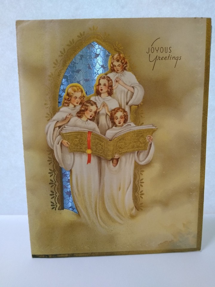 Christmas Greeting Card Angles Singing Music Book Church Window Diecut Vintage