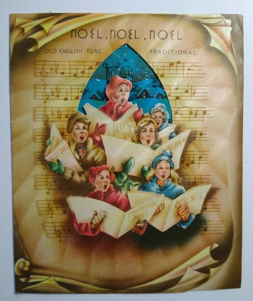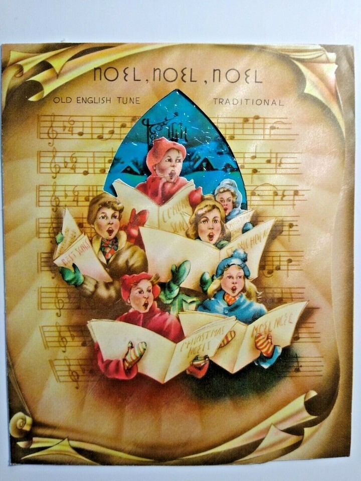 Noel Christmas Carolers Greeting Card Diecut Stained Glass Vintage Mid Century