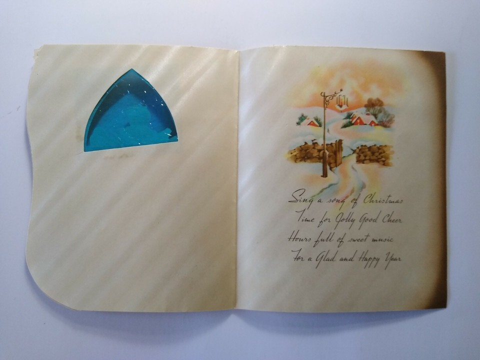 Circa 1940's-1950's mid century modern vintage original used greeting card. Has a blue plastic insert that resembles stained glass. Size is 4.5" x 5.5". Creases to top caroler and back page has damage from album removal. Series 802 USA on back. Stock #gc4.