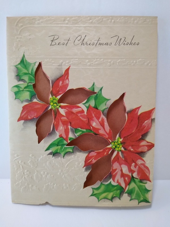 Mid Century Modern Christmas Greeting Card Die-cut Poinsettias Embossed Vintage