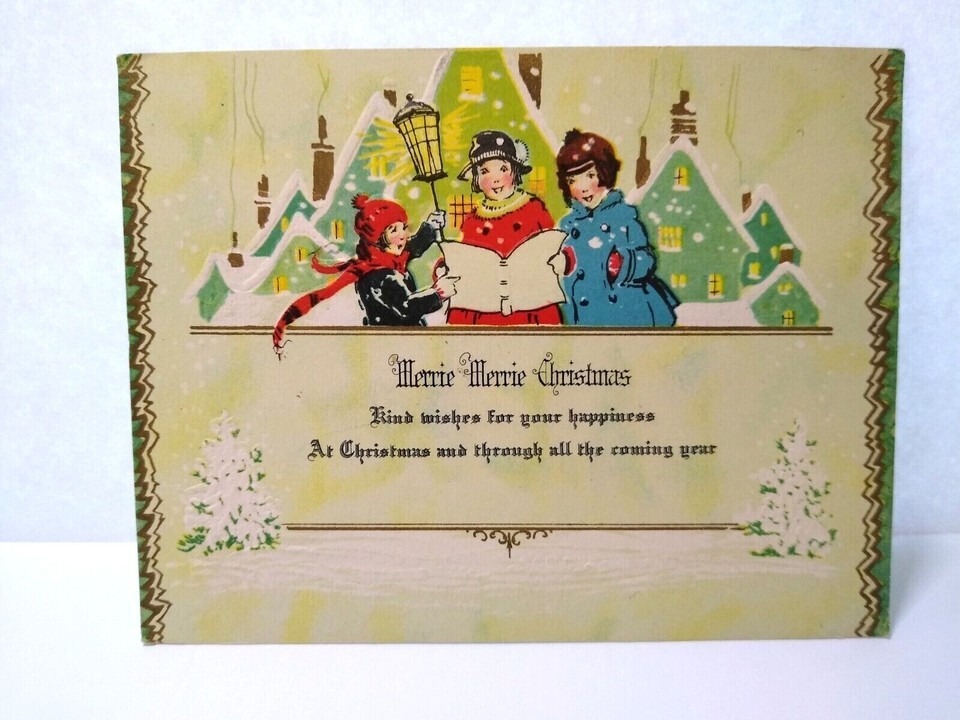 Christmas Greeting Card Merrie Carolers Singling Homes Village Embossed Vintage