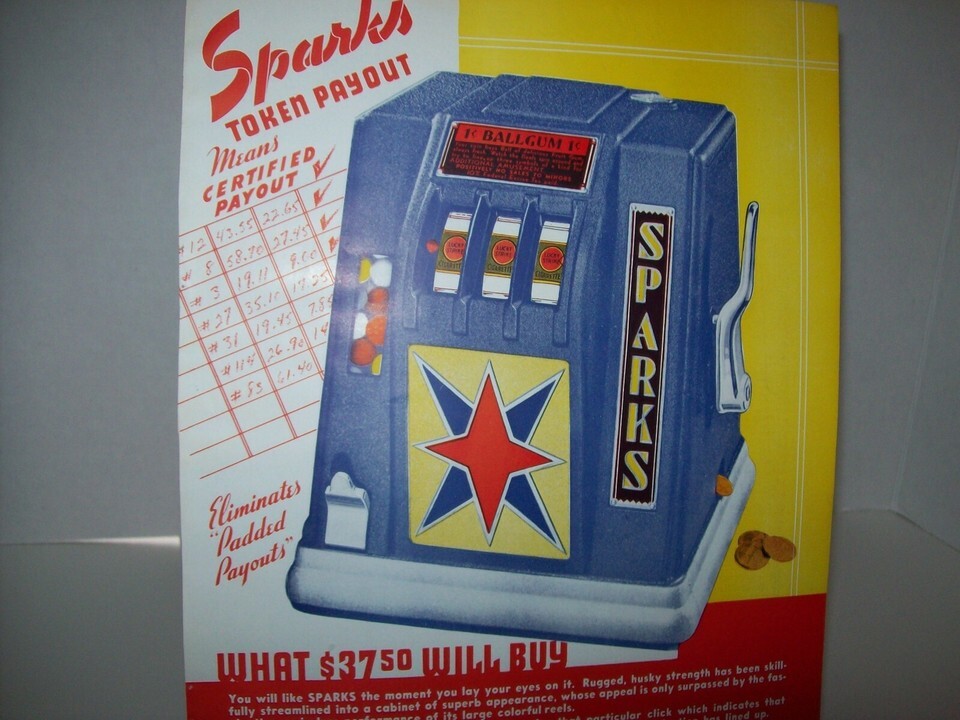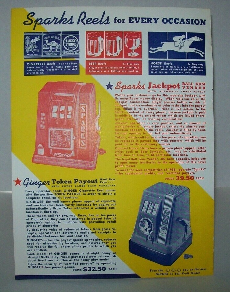 This is an AD from circa 1938 Coin Machine Journal trade magazine. Has light wrinkles, staples holes, and age wear. One edge has wear as it was removed from publication. It is not perfectly even. Back side shows advertising for the Sparks model as well as Ginger token payout machine trade simulator. It can be trimmed and framed if desired. Size is 8.5" x 11.5". See photos.