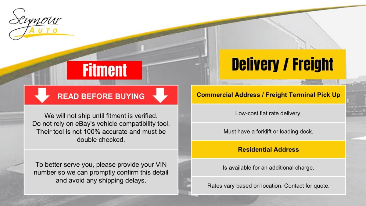 All parts listed as, Pick Up Only, will be held at Seymour Auto Wrecking (107 New Haven Rd, Seymour CT 06483) for the buyer.