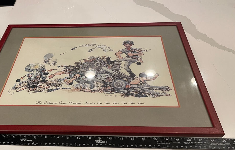 Vintage George Finley print.Good condition some ruffage. George Finley is one of the best known artists of United States Army subjects. Art has been a part of his life since he was very young. As a boy he developed a fervent interest in drawing and he won awards for his paintings in school. As a cadet in West Point his cartoons and illustrations appeared in The Pointer , the cadet literary publication. Soon after graduation in 1960, he began to publish his now well known series of military caricatures. This work features branches, specialties and other aspects of the US Army and is often based on his own military experiences.