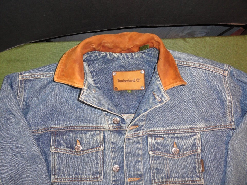 VINTAGE COLLECTIBLE 1985 TIMBERLAND DENIM BLUE JEAN JACKET LEATHER COLLAR SMALL