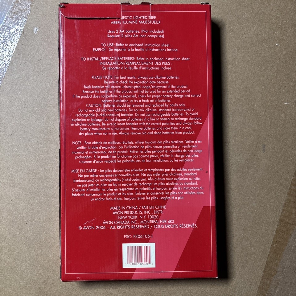 The Avon Majestic Lighted Tree Christmas Decor in Box is a set of 4 battery-operated trees designed for holiday decorating. Made with mixed materials including plastic, these trees feature a festive color scheme of red and gold or orange and gold. Manufactured in China in 2006, these lights are sure to add a touch of holiday cheer to your home during the Christmas season.