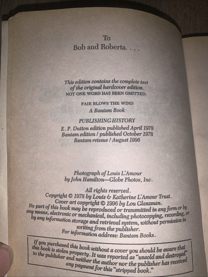 "Fair Blows the Wind" by Louis L'Amour is a vintage Western paperback book from 1990, part of the Talon and Chantry series. Set in the United States, this novel is a classic piece of fiction, perfect for adult readers who enjoy historical and action-packed stories. With 368 pages in the Bantam Edition, this book promises an engaging and immersive reading experience for fans of Western literature.