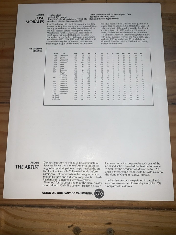 Dodgers/Union 76 Oil Print 1982 : Jose Morales