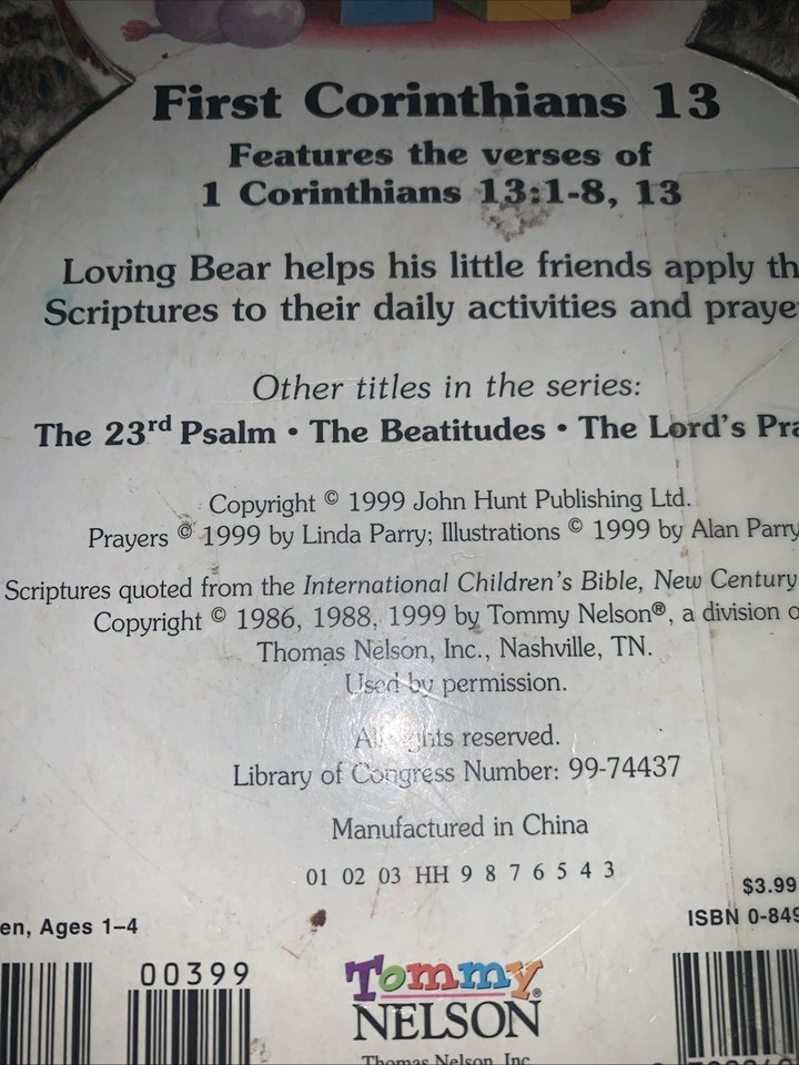 "Prayers with Bears Board Books: First Corinthians 13" is a children's board book published by Nelson Incorporated, Thomas in 1999. Written by Linda Parry and illustrated by Alan Parry, this book is part of the "Prayers with Bears Ser." series. With a focus on religion and biblical studies, this board book explains the concept of love in First Corinthians 13 in a simple and engaging way, making it suitable for both juvenile fiction and nonfiction audiences. The compact size and durable board book format make it a convenient and meaningful addition to any child's library.