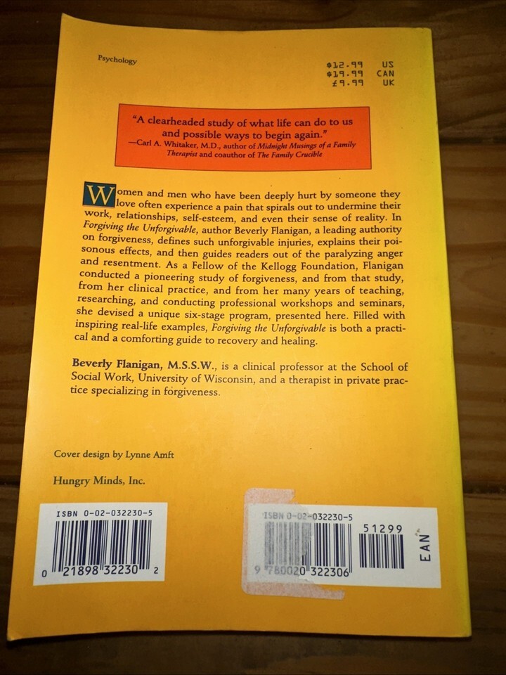 "Forgiving the Unforgivable" by Beverly Flanigan is a self-help book aimed at adults seeking to overcome the bitter legacy of intimate wounds. Published in 1994 by Wiley Sons Canada, The Limited, John, this nonfiction narrative offers insights on forgiving and healing from emotional pain. With a focus on motivation and inspiration, this 288-page trade paperback helps readers navigate through the complexities of personal growth and forgiveness in relationships. Written in English, the book provides a compassionate and insightful approach to dealing with difficult emotional challenges.