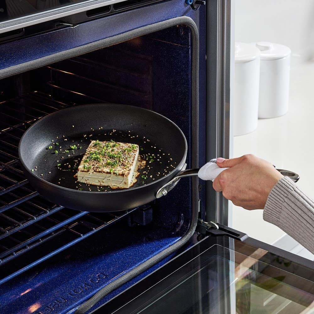 Scratch resistant, hard anodized aluminum is reinforced with an optimized stainless-steel base for improved durability, warp resistance and even, consistent heat.
