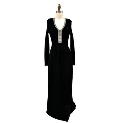 Striking 1980s vintage black knit sweater dress with dramatic rhinestone-embellished cut-out neckline. Form-fitting, body-conscious silhouette with a long sleeve, ankle-grazing length, and zipper back finished with a Talon pull. Knit fabric is high quality, very much like a St. John knit, though no maker or content label is present. The rhinestone neckline is superbly done, suggesting top-quality craftsmanship.