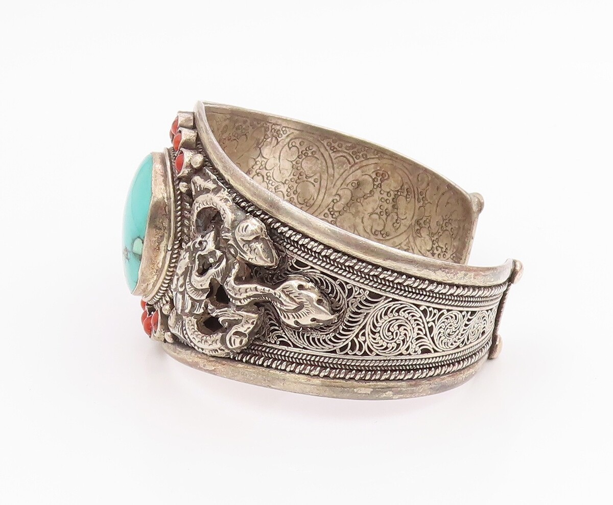 925 Sterling Silver Vintage Bracelet Turquoise & Coral Statement Cuff BT11983