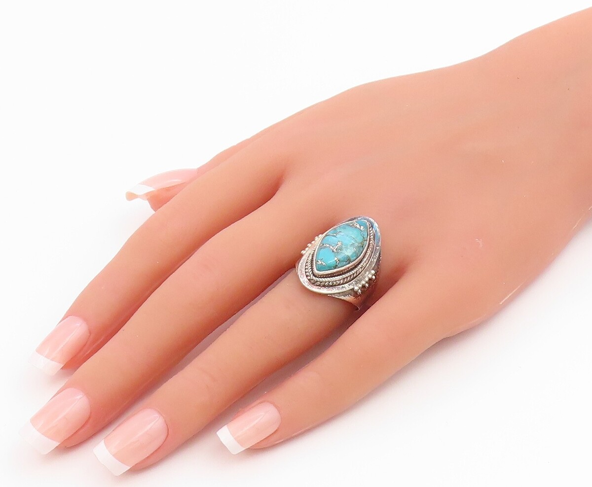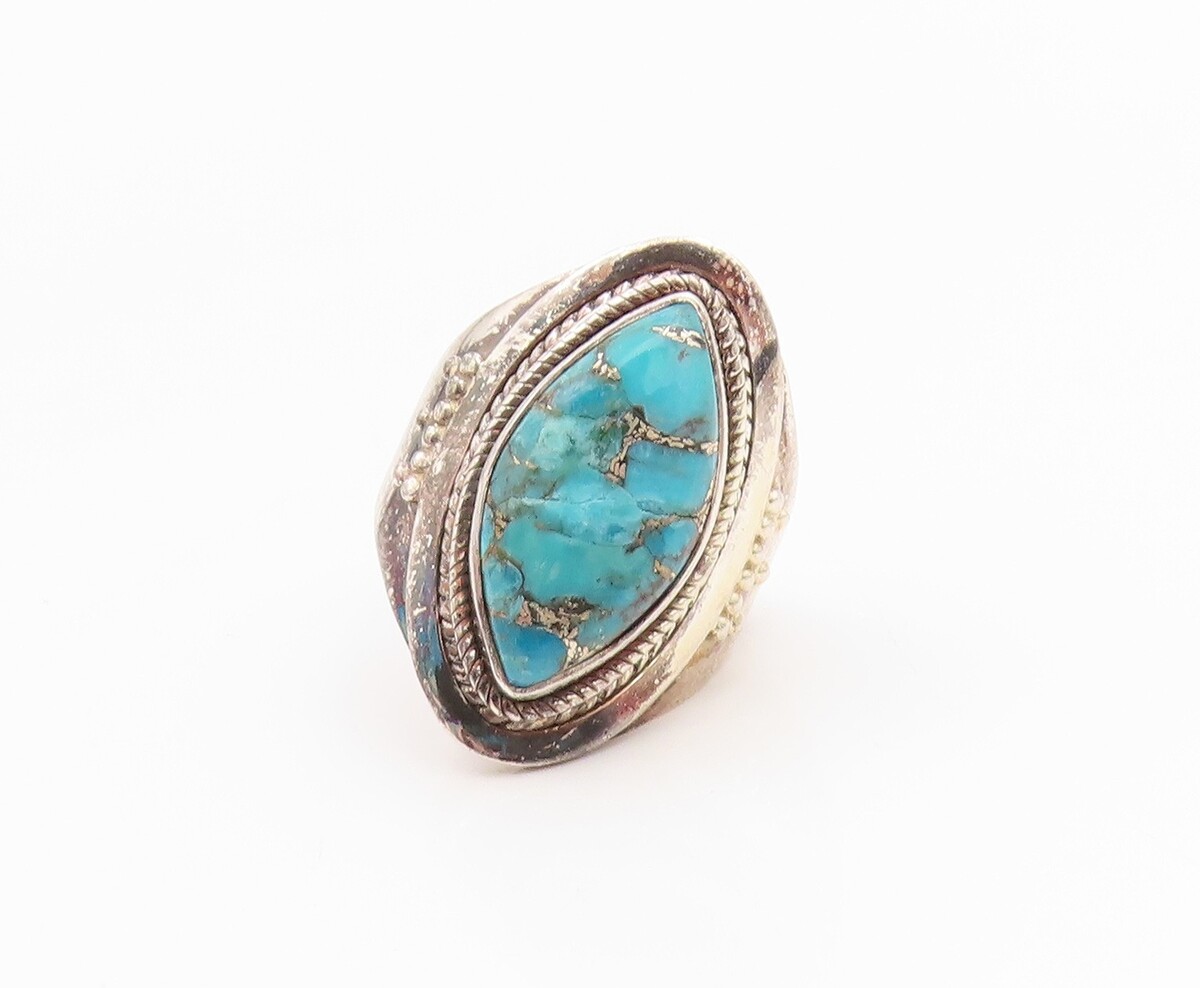 925 Sterling Silver Vintage Ring Marquise Shape Turquoise Band Sz 8 RG35475