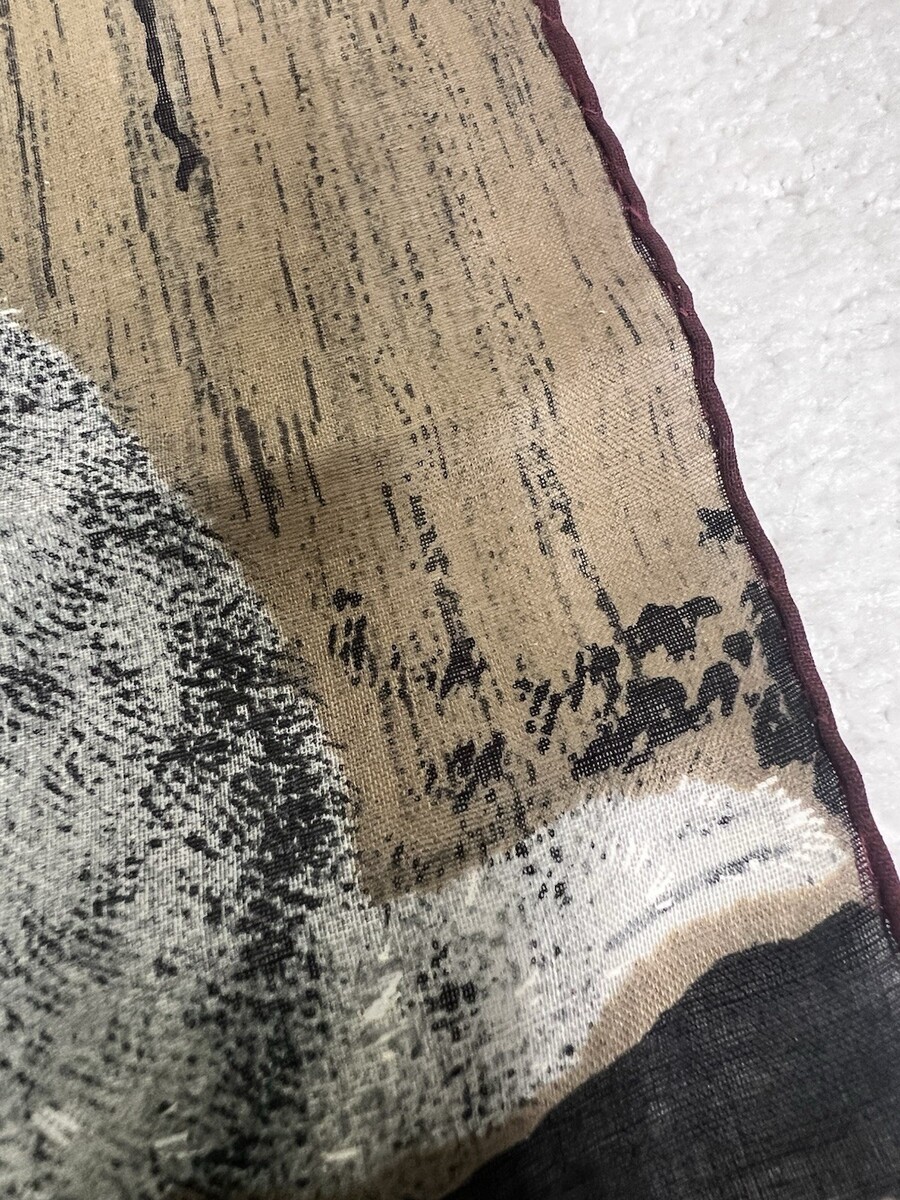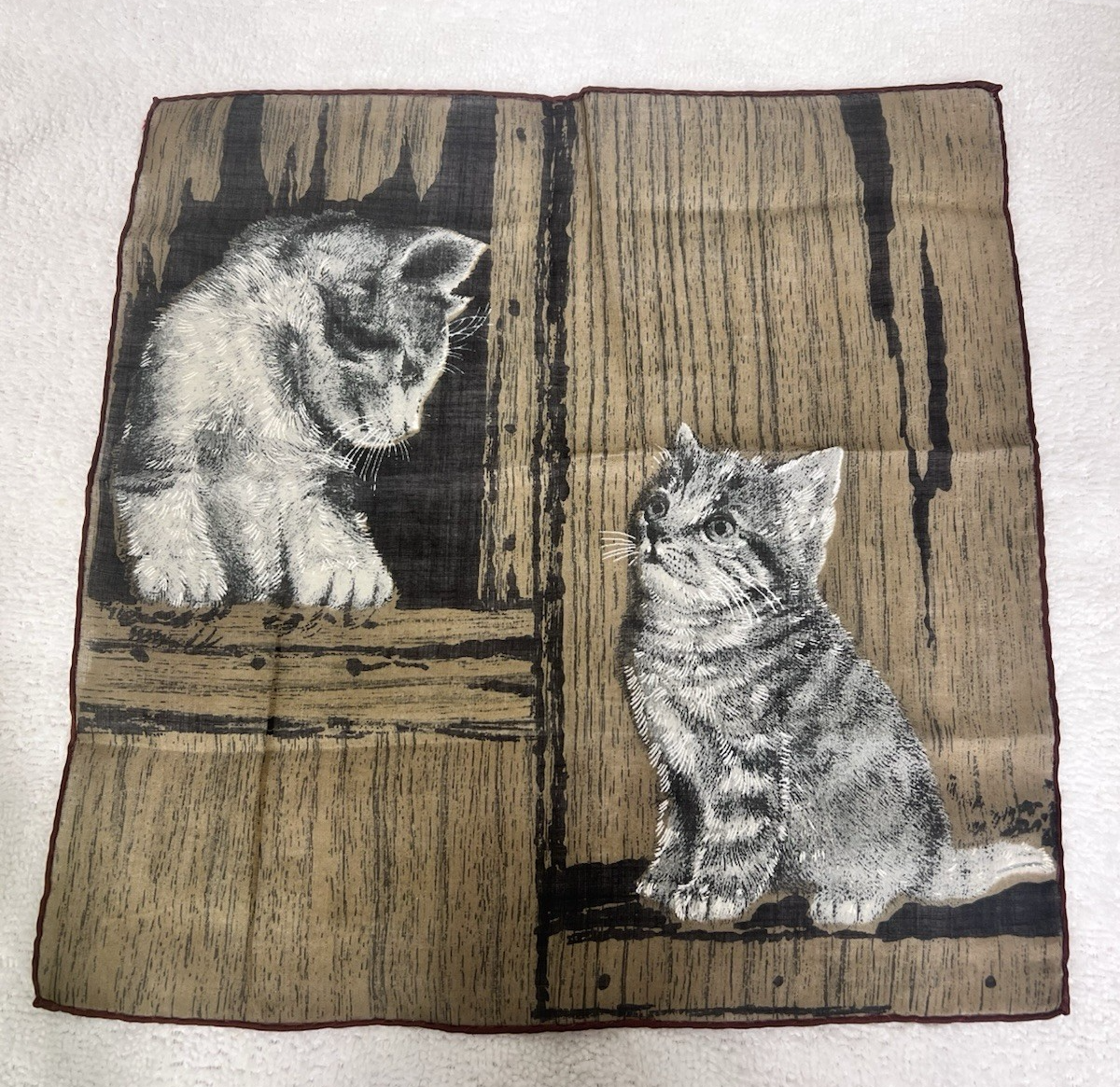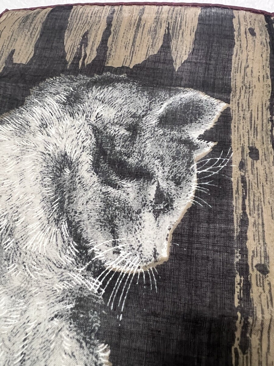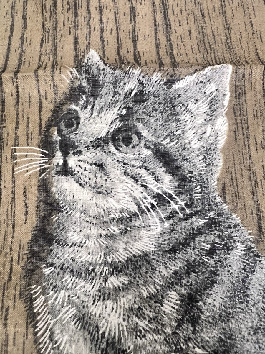 Vintage Handkerchief Hankie Skandia Style Print Screened Barn Cat Kitten. Cute mother cat looking at kitten appears to be a barn farm setting, print seems to be screened onto the fabric not silk likely cotton, hankie measures approx. 10 3/4" by 11 1/4", stitching appears hand done, no damage. See pictures.