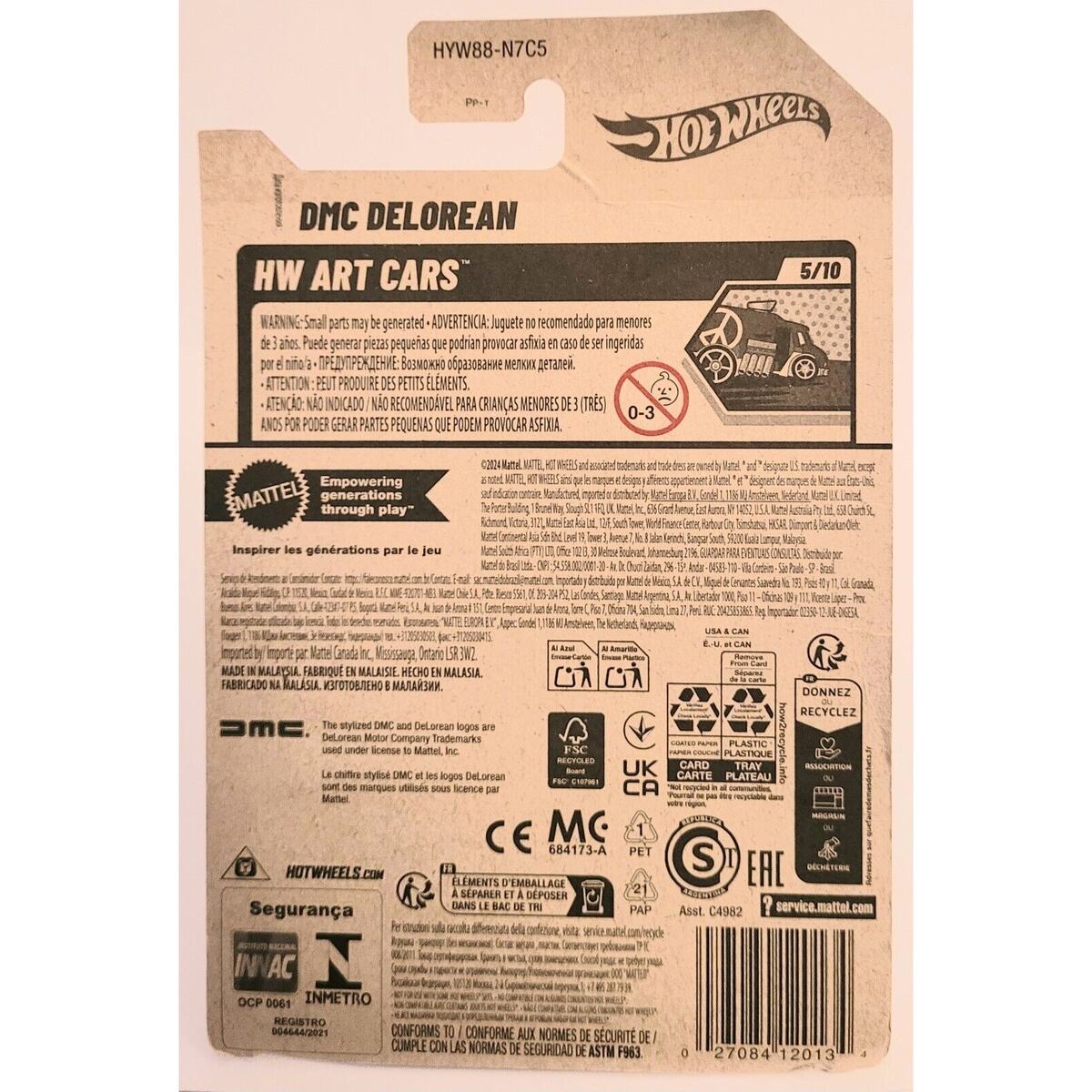 This Hot Wheels 1:64 Diecast DMC Delorean is part of the HW Art Cars series, released in 2024. The black car features intricate details and is a replica of the iconic vehicle. It is recommended for ages 3 and up, making it suitable for a wide range of collectors and enthusiasts. The unopened box adds to the appeal for those looking to keep it as a collectible item. Made of diecast material in Malaysia, this model is a must-have for fans of Hot Wheels and the iconic DMC Delorean.