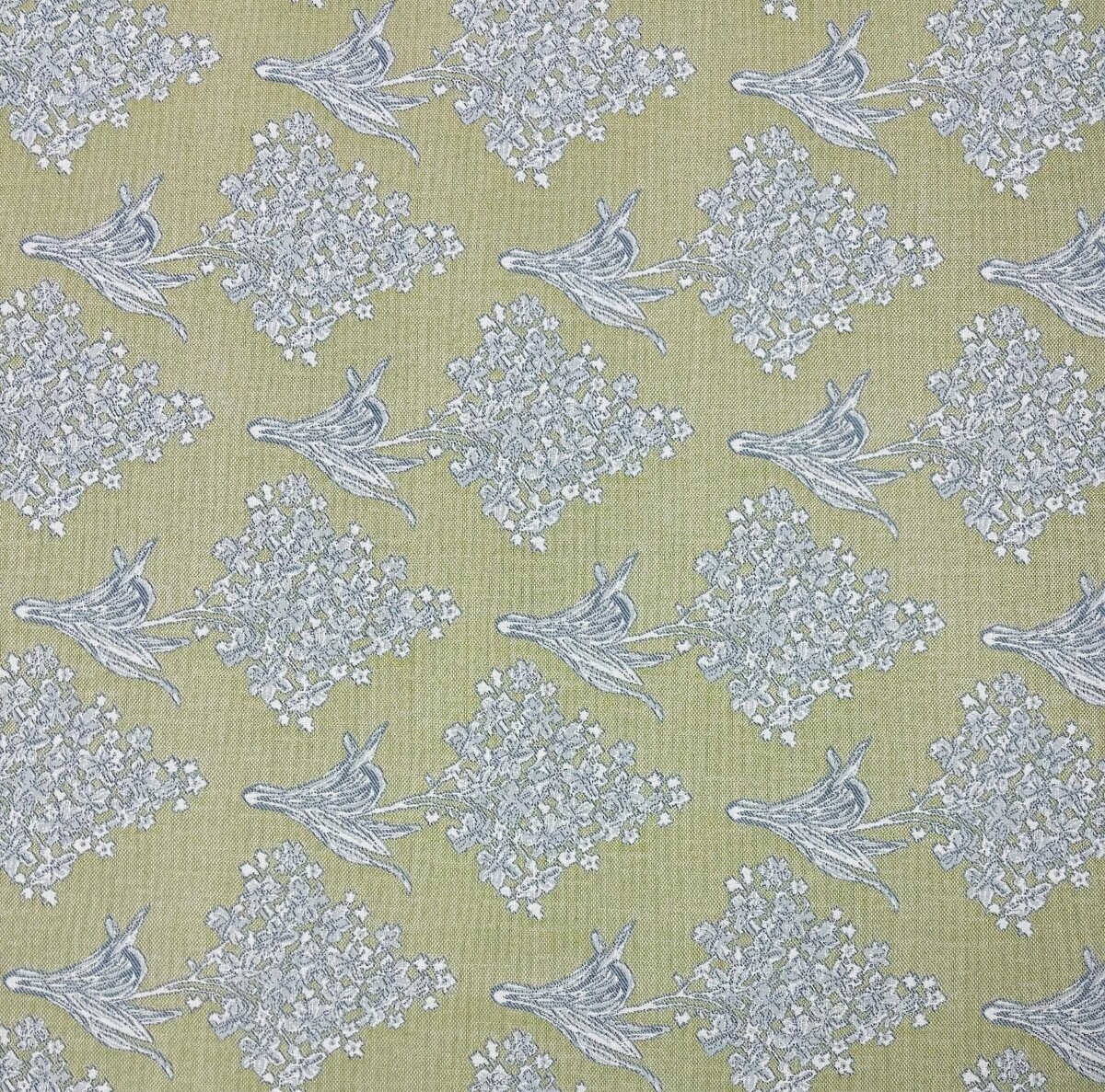 THIS FABRIC IS SO SOFT AND PRETTY YOU WILL NEVER KNOW IT'S REALLY PERFORMANCE. DESIGNED TO CAPTURE THE CHARM AND TEXTURED LOOK OF NEEDLEPOINT, THE STYLIZED FLORAL MOTIF IS WOVEN OF THICK, SUPPLE, SUNBRELLA ACRYLIC IN LOVELY SHADES OF MINERAL AND WHITE ON A FRESH GREEN GROUND.