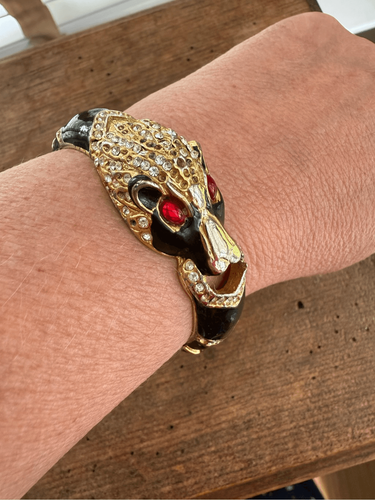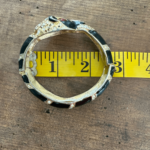 So 90s! This vintage bracelet is unsigned but it has a sticker inside that identifies it as an Anne Klein bracelet dated 1991 with a $50 price tag. It is gold tone and black enamel panther hinge bracelet with clear rhinestones and Ruby red rhinestone eyes on the panther. There are Missing rhinestones mostly on the back of the Panthers head although I do see two missing from the bangle itself. This could easily be replaced if you choose.