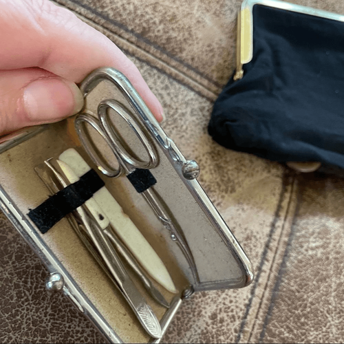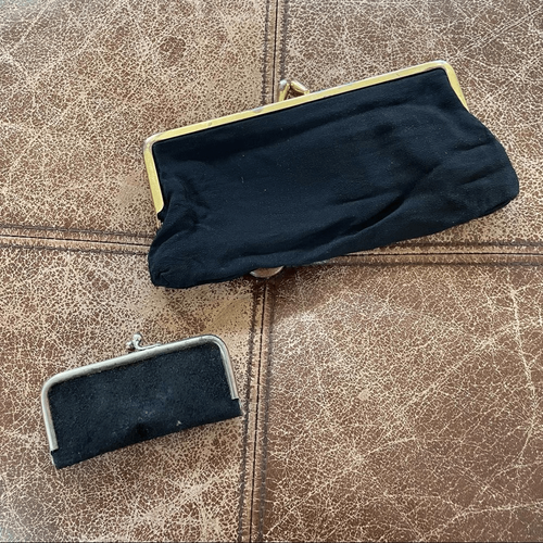 Vintage set of two kiss lock pouches. The first is black and embroidered with colorful flowers and a gold tone kiss lock closure. It measures approximately 7?x3?. The gold tone on the metal Kissock frame is discolored in spots but the pouch itself is adorable. The second piece is tiny at 3?x1.5? With Silvertone Kistler closure. The sueded fabric around the embroidered design is Sueded and it?s kind of crumbly, but still cute. It holds a small pair of scissors, tweezers and a few other quickfix items on the go.