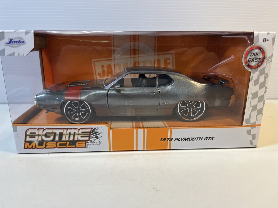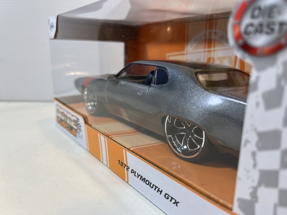 1972 Plymouth GTX Diecast Model Car: 1/24 Scale, New In Box By Jada. This Diecast car checks all the boxes for a reasonably priced rendition of the classic die cast 1972 Plymouth GTX.