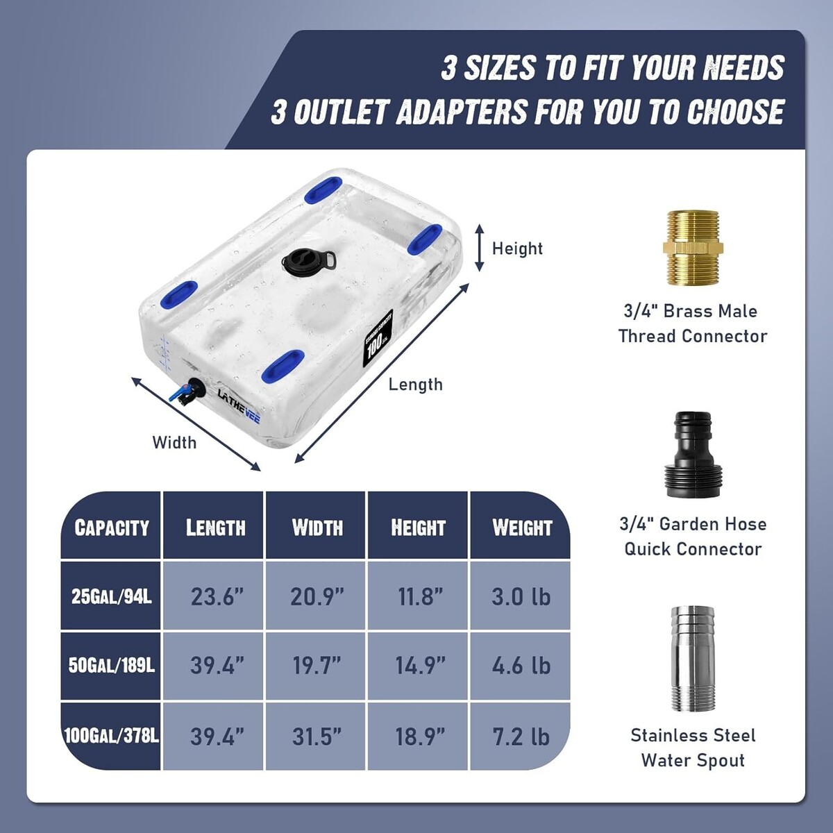 EASY TO USE AND CLEAN: The upgraded design of 3.54-inch large diameter opening allows fill up with water quickly and makes it easy to clean the inside of the water bag with a soft brush or other similar cleaning tools. The water outlet includes three types of adapters can be installed according to your needs. The four molded handles make it more convenient for you to hold and transport. Our water storage tank is an essential for your emergency preparedness kit and everyday needs.